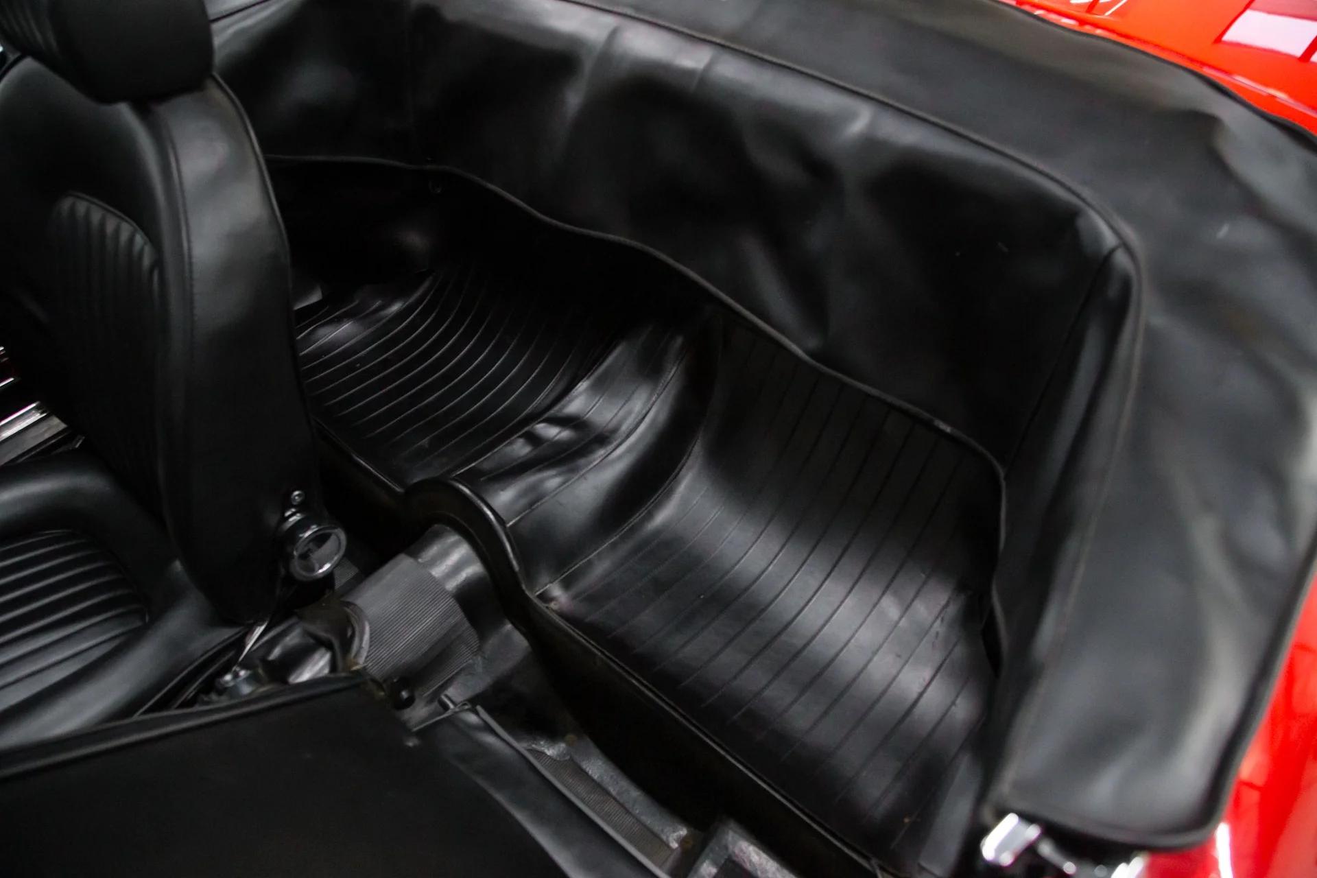 The front bucket seats are trimmed in black vinyl upholstery and are complemented by a color-coordinated dashboard, door panels, and floor coverings. Appointments include a wooden shift knob, Alfa Romeo-branded rubber floor mats, lap belts, and crank windows. The door cards, heater fascia, stop top catches, and anti-rattle straps were replaced in 2024