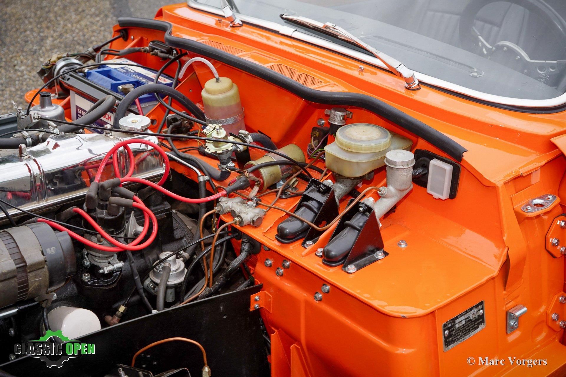 De carrosserie werd van binnen en van buiten voorzien van een schitterende oranje lak. Deze Spitfire 1500 TC toont alle prachtige originele details en de auto verkeert in excellente staat! De Triumph Spitfire is een meesterwerk ontworpen door de beroemde Italiaanse ontwerper Michelotti.