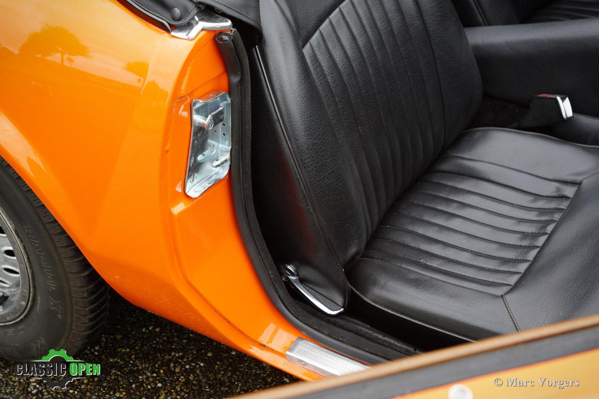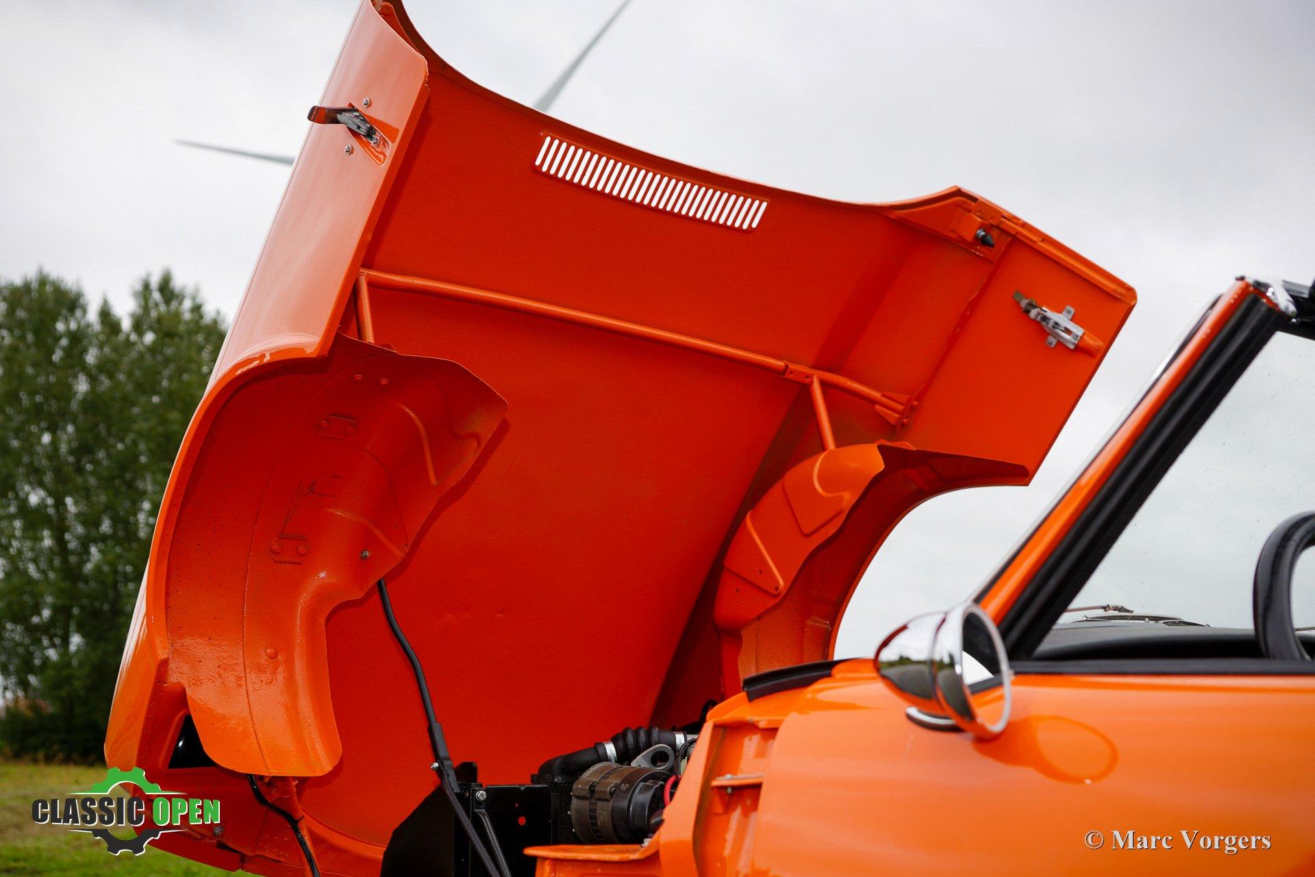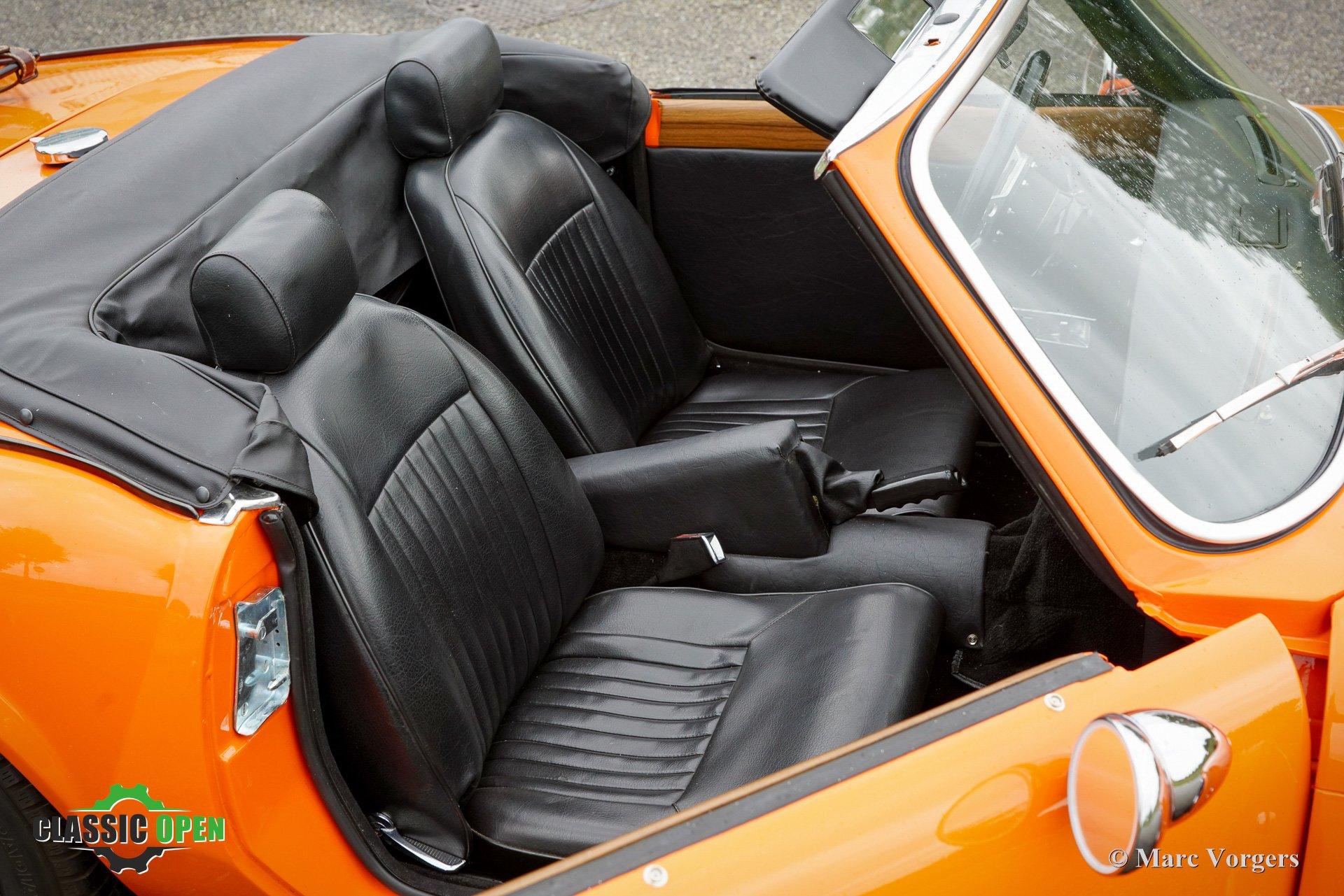 Kleur oranje gecombineerd met een zwart kunstlederen interieur en zwart tapijt. Zwarte vinyl soft-top en kapafdekking.
