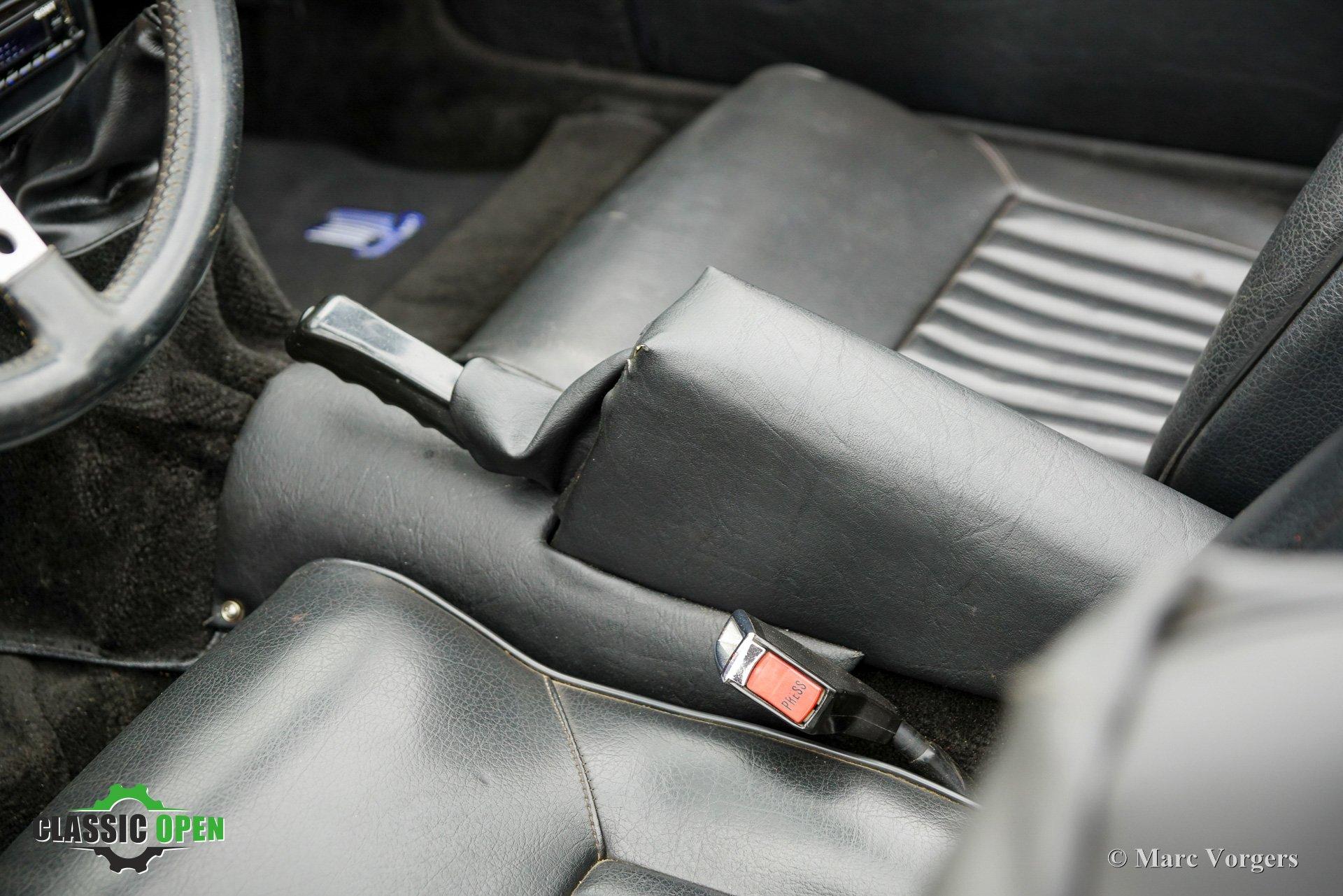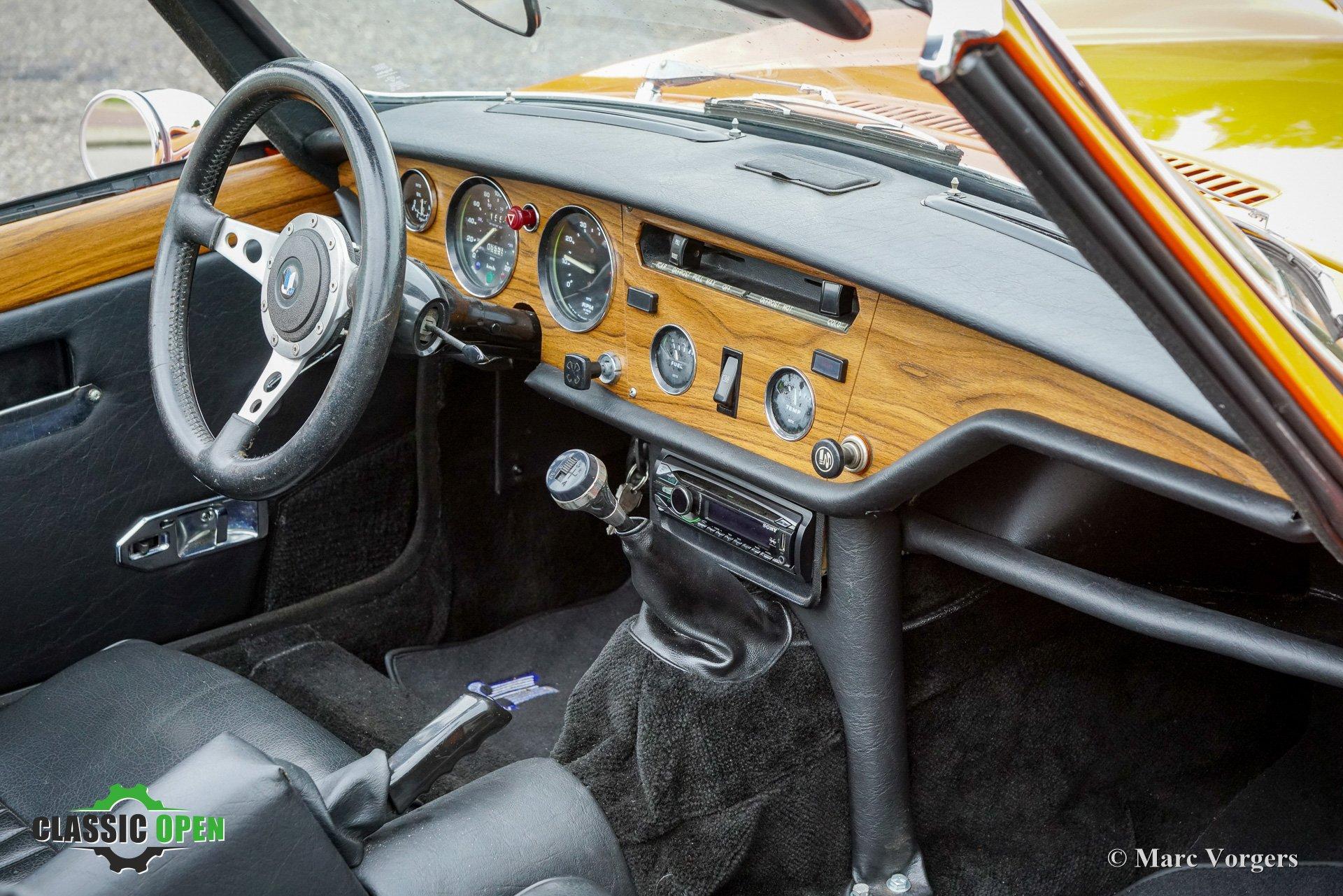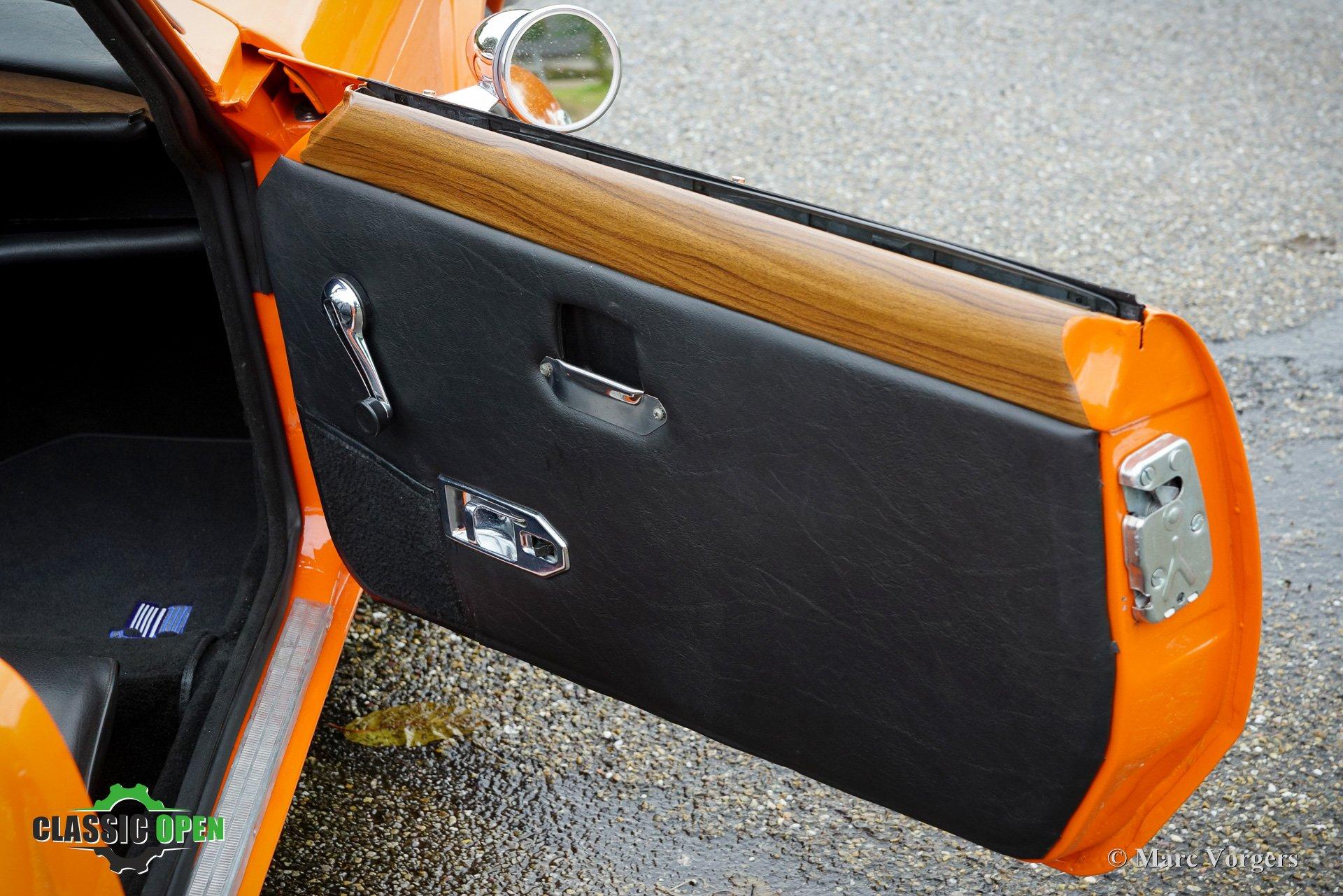 Kleur oranje gecombineerd met een zwart kunstlederen interieur en zwart tapijt. Zwarte vinyl soft-top en kapafdekking.